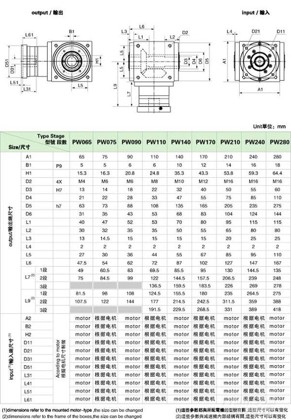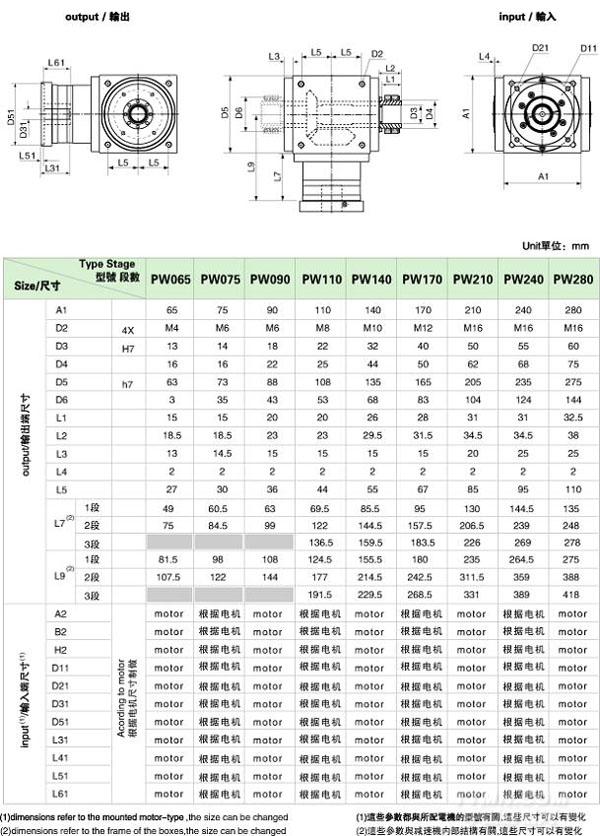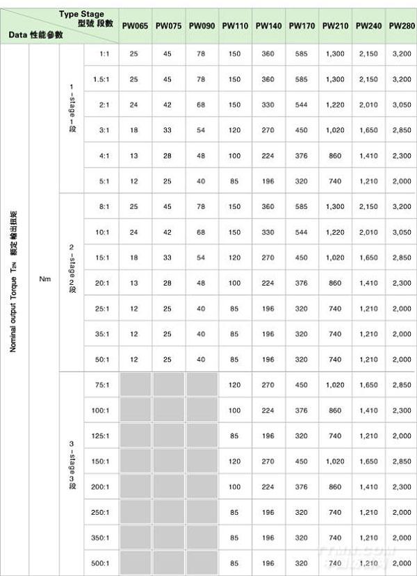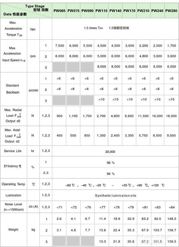 PW 系列精密行星減速機技術(shù)參數(shù)