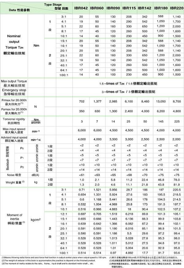 IBR 系列精密行星減速機技術參數