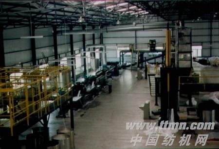 工藝流程 (前紡的絲束)→集束架→上導絲架→七輥導絲機→浸油槽→七輥牽伸機→水浴牽伸槽→第二七輥牽伸機→蒸汽牽伸箱→第三七輥牽伸機→上油機→卷曲機→抽濕機→①(三維卷曲中空纖維)→噴硅油機→張力機→切斷機→擺絲機→松弛熱定形機→風送系統→打抱機 ②(普通纖維→輸送機→擺絲機→松弛熱定形機→張力機→切斷機→風送系統→打包機 主要特點與用途 年產3000噸滌三維卷曲中空短纖維柔性生產線既能生產普通短纖維,又能生產三維卷曲中空短纖維。整個生產線由紡絲卷繞聯合機和后處理聯合機及公用工程三部分組成。經各使用廠家長期生產證實:該生產線設計合理、運行可靠、工藝成熟、質量穩定。用它生產的絲束質量達到了國標準,并接近國內最好水平。
