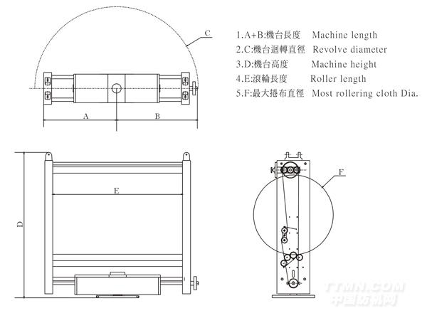 本機分(單面車與雙面車),(正轉(zhuǎn)車與逆轉(zhuǎn)車),其適用之機臺針筒,配合之滾輪長度,布匹捲收直徑大小,機臺高度,所需迴轉(zhuǎn)直徑,均隨需求而改變,故於訂購時依客戶需求再行研議。