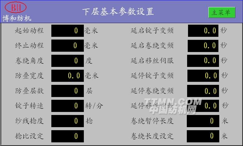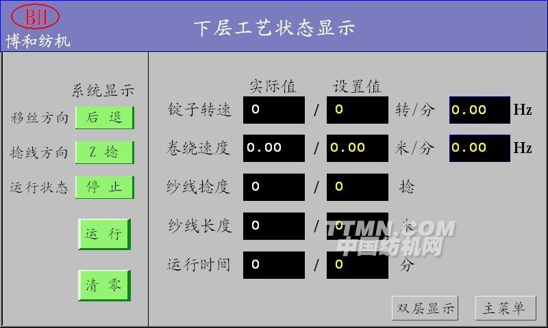 該控制系統采用基于隆昌倍捻機專用運動控制LCBNJ-10和WEINVIEW系列觸摸屏的捻線機自動控制系統。通過LCBNJ-10運動控制完成了捻線機系統中橫動電機,卷繞電機和錠子電機的轉速控制,并通過WEINVIEW系列觸摸屏可以完成各項數據和參數的設置,快速完成紗線產品的生成工藝的變換。